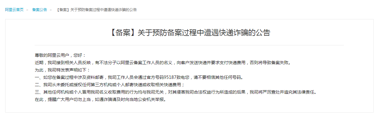 阿里云【備案】關于預防備案過程中遭遇快遞詐騙的公告